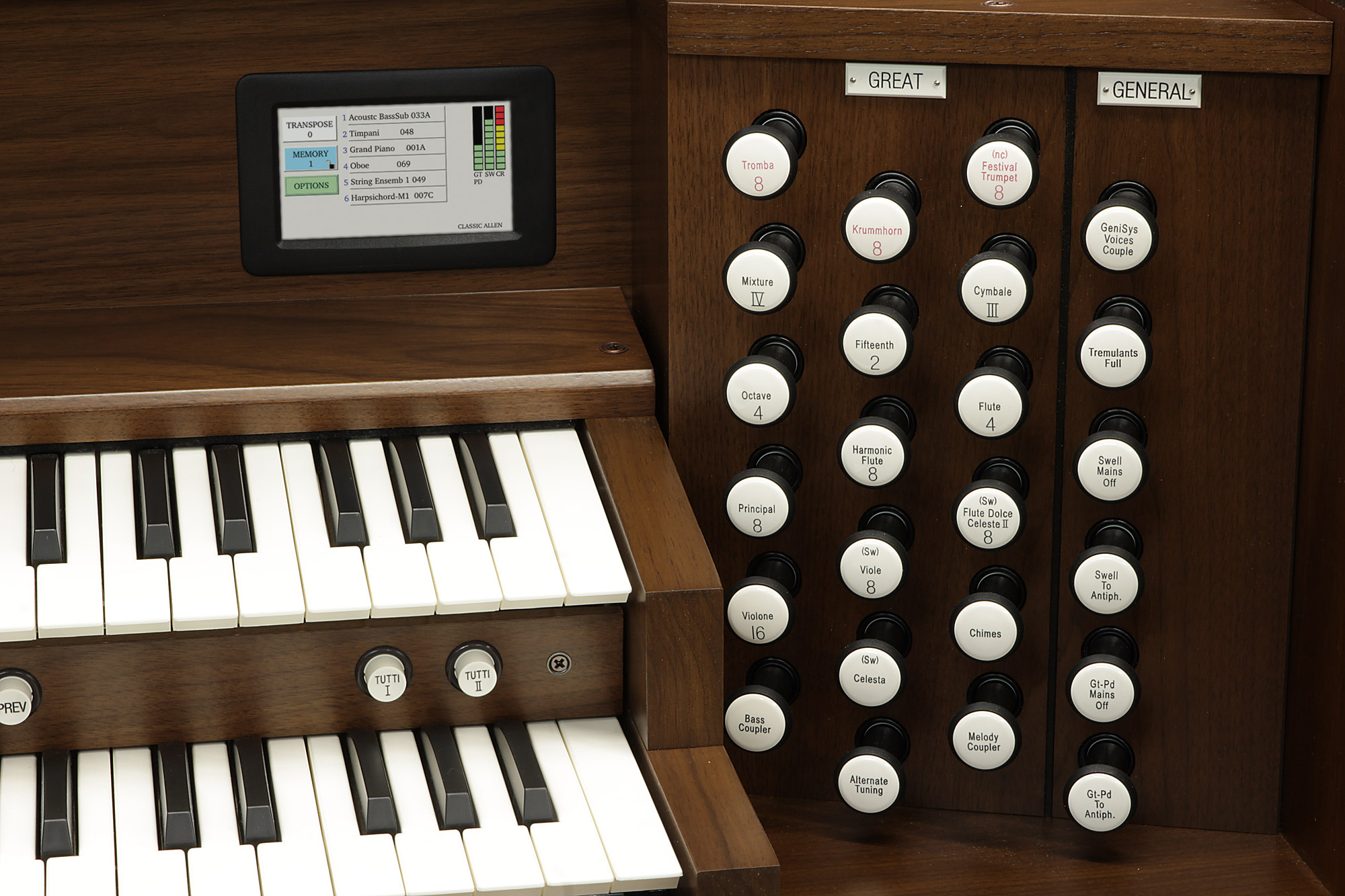 - 2 registros dedicados de GENISYS Voices™ por división del órgano