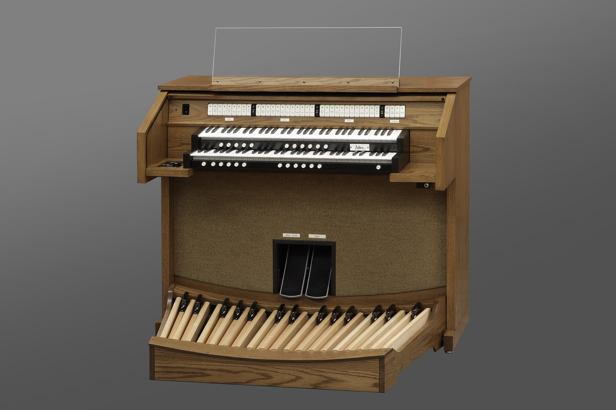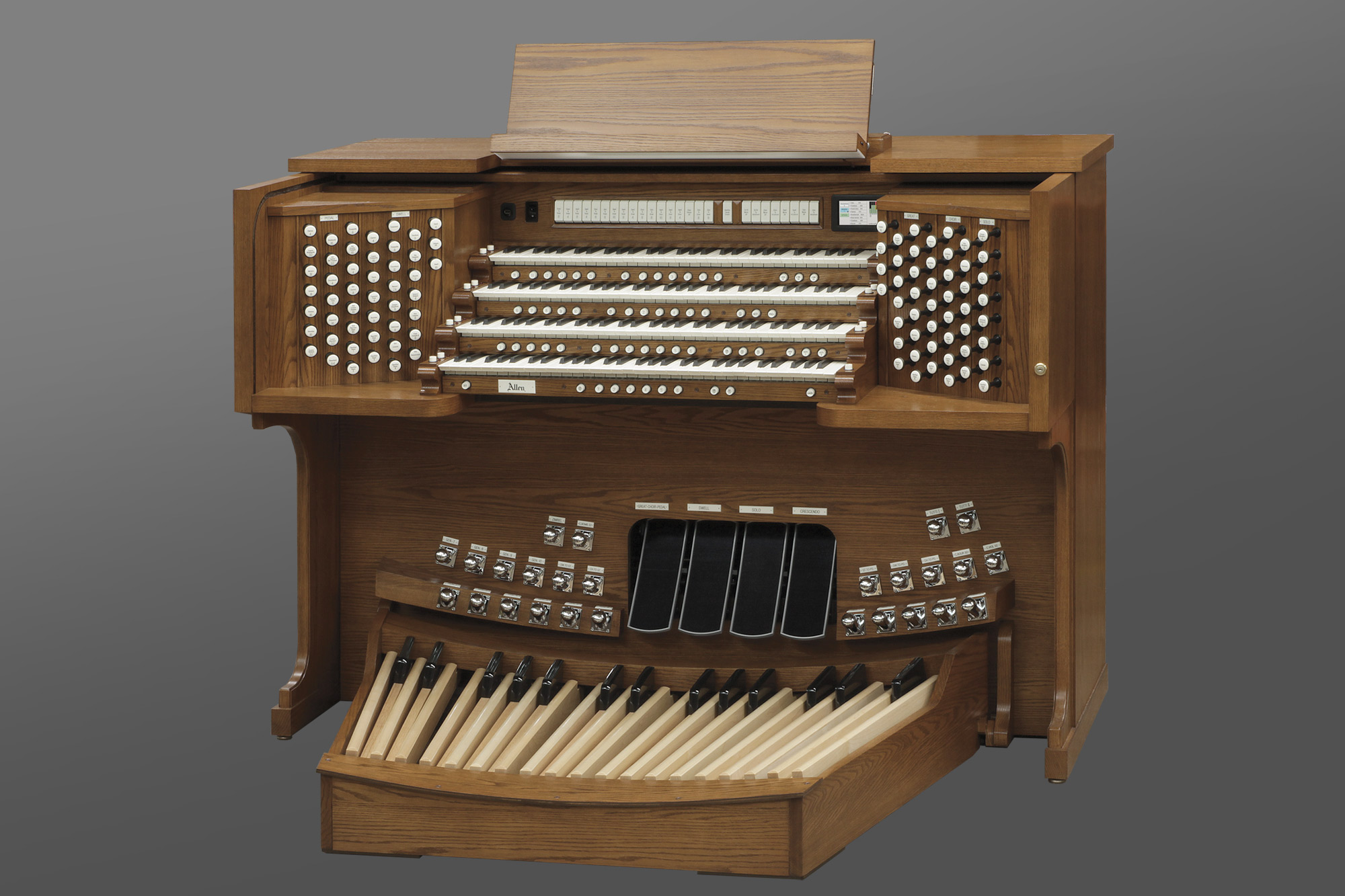 Los órganos para iglesia de Allen ofrecen un estilo lujoso y un sonido rico. Con tecnología de muestreo avanzada y construcción de consola artesanal, los instrumentos Allen ofrecen el sonido y la calidad legendarios de Allen. La sorprendente belleza de su fina construcción de madera artesanal también cumple con los exigentes estándares de durabilidad de Allen. La mayoría de los modelos se pueden construir con controles de registros LED o móviles de jalón de primera calidad.